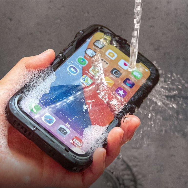 Кейс виготовлений з ударостійкого полікарбонату та м’якої на дотик гуми, яка амортизує пристрій під час падіння. Крім того, він оснащений силіконовими прокладками та спеціальними акустичними мембранами, завдяки чому корпус не впливає на якість з'єднань та звуку. Конструкція корпусу створює гібридний та надійний захист (військовий сертифікат Shock & Drop MIL-STD 810G на падіння з висоти 2 м). Корпус відповідає найвищим стандартам герметичності (сертифікат IP-68 на глибину до 10 м). Користувач може легко підключити телефон до зарядного пристрою (стосується операцій, що виконуються на суші), регулювати гучність, використовувати кнопку сну та пробудження, вимикач вимкнення звуку. Catalyst Waterproof - єдиний чохол, який вам знадобиться для екстремальних подорожей!