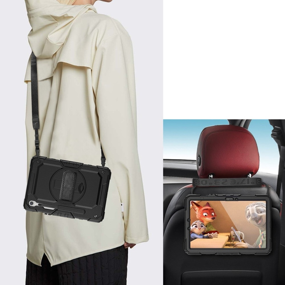 Бронированный чехол для Samsung Galaxy Tab S10 Lite / S10 FE / S9 FE, защитный 360 с местом для стилуса, чёрный - это чрезвычайно прочный чехол, предназначенный для защиты вашего устройства со всех сторон и во время самых экстремальных происшествий. Корпус чехла выполнен из жесткого поликарбоната, а остальная часть конструкции - из матового силикона, гасящего вибрации и обеспечивающего сцепление с поверхностью. В чехол идеально вписывается встроенное поликарбонатное стекло с твердостью 4h и уплотнители, защищающие места, наиболее подверженные воздействию пыли, песка и воды. Производитель не забыл и о полезной подставке, держателе или шнурке. В нем также предусмотрено место для стилуса. Это полноценный чехол, отвечающий всем требованиям защиты.