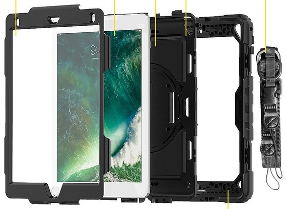 Trzyczęściowy pancerz, który zapewnia najwyższą amortyzacje upadków. Niezwykle wytrzymałe i zaprojektowane tak, aby zabezpieczyć urządzenie ze wszystkich stron, nawet podczas najbardziej ekstremalnych sytuacji. Korpus pokrowca został wykonany ze sztywnego poliwęglanu, a o resztę konstrukcji zadbał matowy silikon, tłumiący drgania oraz zapewniający świetną przyczepność. Obrotowa, pracująca w zakresie 360°, podpórka daję możliwość ustawienia krajobrazowego lub portretowego a regulowany pasek ułatwia przenoszenie. Etui posiada wbudowaną ochronę na ekran oraz miejsce na rysik.